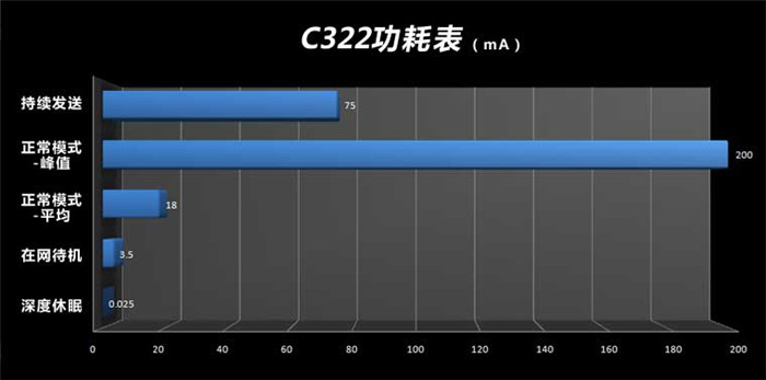 功耗一直是影響WIFI模塊推廣的限制因素之一,在此之前最低功耗的是有人的USR-WIFI232-T,在網(wǎng)待機最低功耗12mA,而C322在功耗控制上更加優(yōu)秀,根據(jù)應用情況支持5種功耗模式,在網(wǎng)待機最低功耗僅3.5mA,深度休眠甚至低至25uA,功耗控制可謂業(yè)界最高水準了。 |