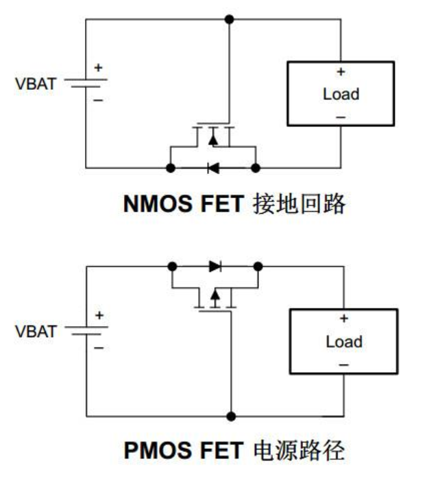 在每個(gè)電路中,MOS管的體二極管面向正常電流的方向。當(dāng)電源反向時(shí),NMOS(PMOS)柵極電壓為低(高),從而阻止其導(dǎo)通。正確安裝電源并正常通電后,NMOS(PMOS)的柵極電壓將變?yōu)楦唠娖?低電平),并且其通道會(huì)使二極管短路。