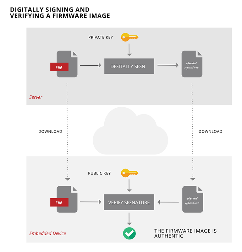 一個(gè)常用的方法是使用數(shù)字簽名。數(shù)位簽名和簽名驗(yàn)證被用來(lái)驗(yàn)證數(shù)據(jù)。在這種情況下作為固件映像文件的可靠性較高。原理是以不對(duì)稱(chēng)的方式進(jìn)行加密,用一個(gè)加密的方式指定作為公鑰,另一個(gè)指定為私鑰??尚艁?lái)源使用私有密鑰簽署合法固件鏡像文件,并且允許將簽名與圖像文件一起下載。該設(shè)備下載圖像文件和簽名,然后使用一個(gè)公共密鑰來(lái)驗(yàn)證簽名。