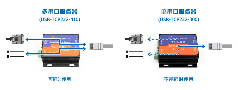 串口服務(wù)器分為單串口服務(wù)器和多串口服務(wù)器,“有人”的T24系列為單串口方案(-300典型,485和232二選一,不能同時(shí)使用),M4系列為多串口方案(-410典型,485和232可同時(shí)使用)。