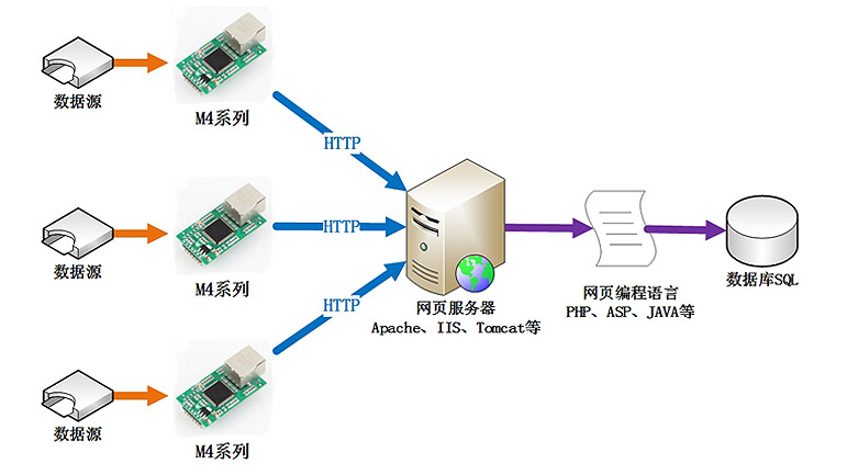 M4系列的Httpd client功能完美解決這個(gè)問(wèn)題,只要按照一定格式向模塊串口發(fā)送數(shù)據(jù),數(shù)據(jù)將以Http方式直接提交給像apache、IIS、tomcat這類web服務(wù)器,普通的網(wǎng)站編程人員利用PHP、ASP等語(yǔ)言就可以直接做數(shù)據(jù)庫(kù)存儲(chǔ)等處理。做B/S架構(gòu)系統(tǒng)的不二之選!
