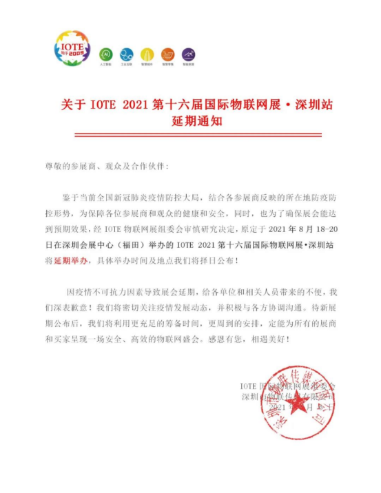 有人物聯(lián)網(wǎng)近日收到IOTE物聯(lián)網(wǎng)展組委會(huì)通知,因疫情不可抗力因素,原定于2021年8月18-20日在深圳會(huì)展中心(福田)舉辦的IOTE 2021第十六屆國(guó)際物聯(lián)網(wǎng)展?深圳站將延期舉辦,具體舉辦時(shí)間及地點(diǎn)將由主辦方擇日公布。