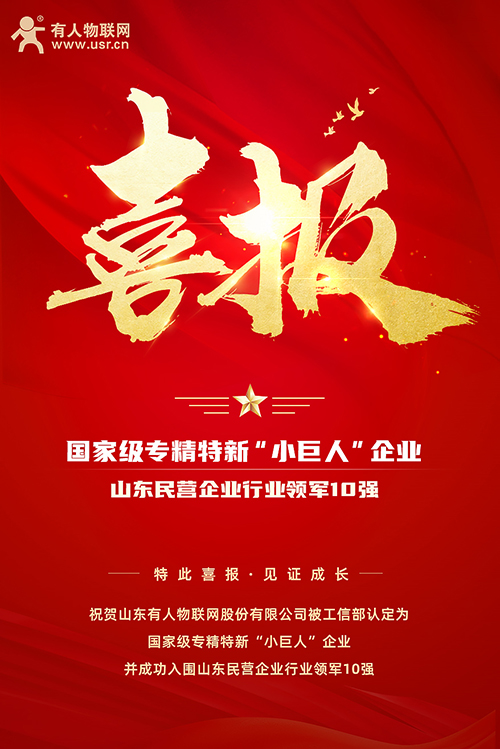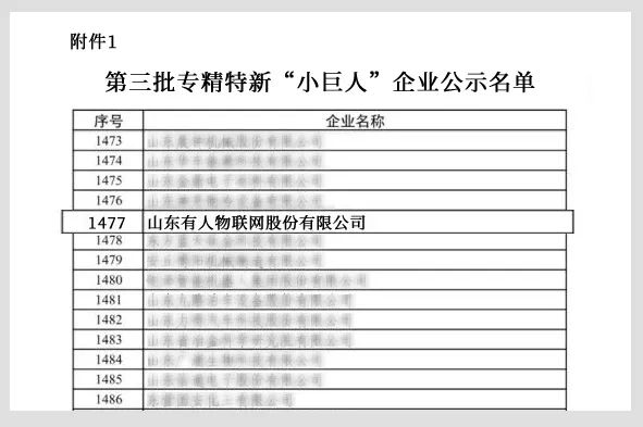 近期,工業(yè)和信息化部公示了第三批國家級專精特新“小巨人”企業(yè)名單,山東有人物聯(lián)網(wǎng)股份有限公司被工信部認(rèn)定為國家級專精特新“小巨人”企業(yè)。