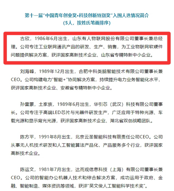 近日,在中國共產(chǎn)黨成立100周年之際,共青團中央、人力資源社會保障部聯(lián)合開展第十一屆“中國青年創(chuàng)業(yè)獎”評選表彰活動。經(jīng)過前期報名、初審、復評、終評等階段,有人物聯(lián)網(wǎng)創(chuàng)始人古欣成功入圍第十一屆“中國青年創(chuàng)業(yè)獎?科技創(chuàng)新特別獎”評選名單。
