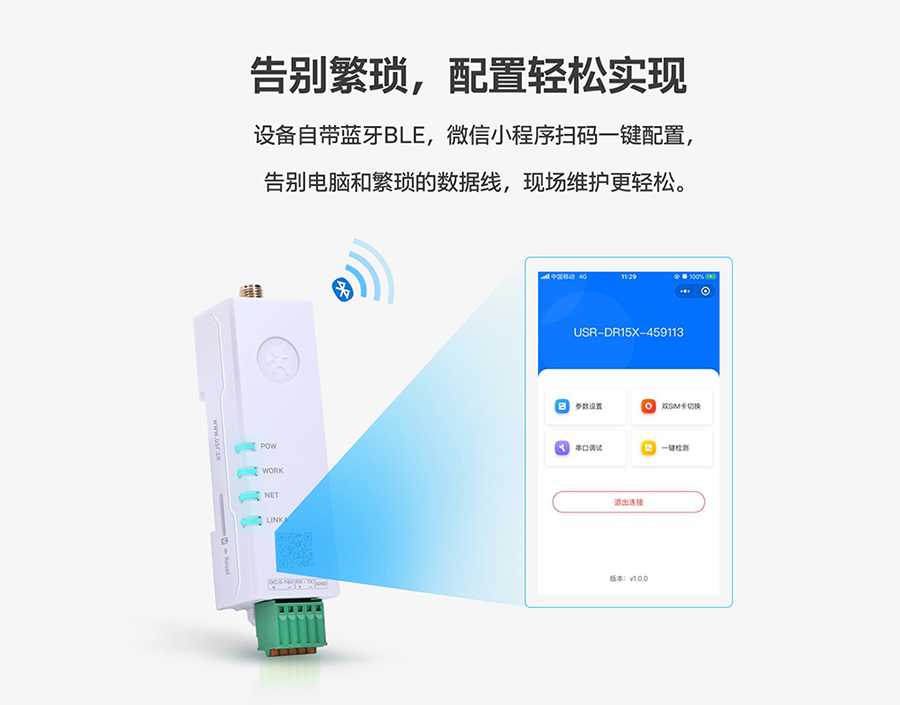 首先,DR154采用人性化設(shè)計(jì),設(shè)備自帶藍(lán)牙BLE,用戶無(wú)需了解復(fù)雜的數(shù)據(jù)傳輸過(guò)程,也無(wú)需攜帶笨重的電腦,只需拿出手機(jī),掃描DR154外殼上的二維碼,自動(dòng)開(kāi)啟藍(lán)牙建立連接,通過(guò)簡(jiǎn)單配置,即可進(jìn)行無(wú)線數(shù)據(jù)收發(fā),完美解決小數(shù)據(jù)量在復(fù)雜環(huán)境中的超遠(yuǎn)距通信問(wèn)題。