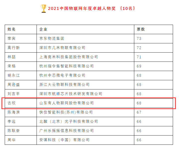 2022年3月16日,“2021年物聯(lián)之星”中國物聯(lián)網(wǎng)產(chǎn)業(yè)年度評選結(jié)果正式揭曉。本屆“物聯(lián)之星”評選自啟動以來吸引了超500家物聯(lián)網(wǎng)全產(chǎn)業(yè)鏈上的優(yōu)秀企業(yè)參與,共有800余名行業(yè)專家評委參與投票。最終,有人物聯(lián)網(wǎng)董事長古欣獲2021年度物聯(lián)網(wǎng)年度卓越人物獎,有人物聯(lián)網(wǎng)獲2021年度最具有投資價(jià)值企業(yè)獎、2021年度最有影響力物聯(lián)網(wǎng)通訊企業(yè)獎。
