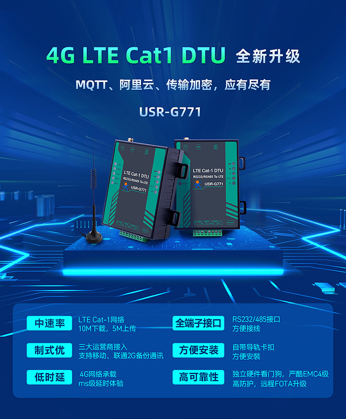 G771是有人物聯(lián)網(wǎng)為實(shí)現(xiàn)終端設(shè)備和服務(wù)器平臺端之間數(shù)據(jù)通信而開發(fā)的Cat1 DTU產(chǎn)品。為進(jìn)一步優(yōu)化產(chǎn)品傳輸性能,有人對系統(tǒng)進(jìn)行了重大改進(jìn)和升級。新版本增加了MQTT協(xié)議、SSL加密的功能,適用性更強(qiáng),數(shù)據(jù)傳輸更安全。