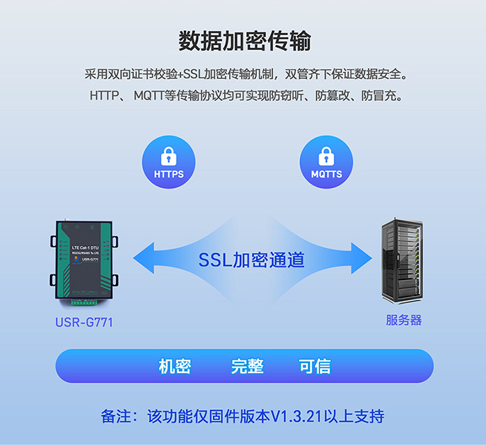 于內(nèi):新版G771采用雙向證書檢驗(yàn)+SSL加密傳輸機(jī)制,雙管齊下保證數(shù)據(jù)安全。HTTP/MQTT等傳輸協(xié)議均可實(shí)現(xiàn)防竊聽、防篡改、防冒充。