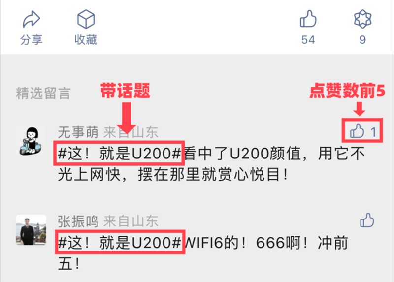 以#這!就是U200#為話題,留言內(nèi)容圍繞“你想要入手U200的原因”或“你想將U200用在什么場(chǎng)景”。留言示例如下圖: