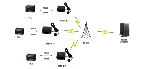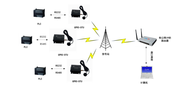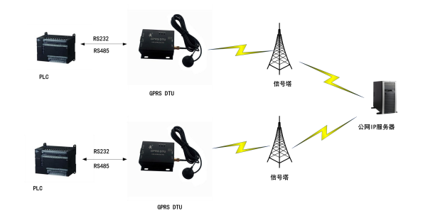 有公網(wǎng)服務(wù)器的應(yīng)用模式是GPRS DTU常用的模式之一,客戶設(shè)置GPRS DTU所連接的目的地址為自己搭建的服務(wù)器,在服務(wù)器上運(yùn)行相應(yīng)的監(jiān)控/檢測軟件來接受生產(chǎn)現(xiàn)場的設(shè)備通過GPRS DTU轉(zhuǎn)發(fā)過來的數(shù)據(jù),并將控制指令通過GPRS網(wǎng)絡(luò)轉(zhuǎn)發(fā)到生產(chǎn)現(xiàn)場的設(shè)備。