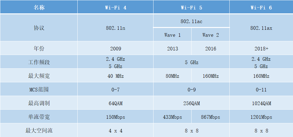 WiFi4、WiFi5、WiFi6參數(shù)對比