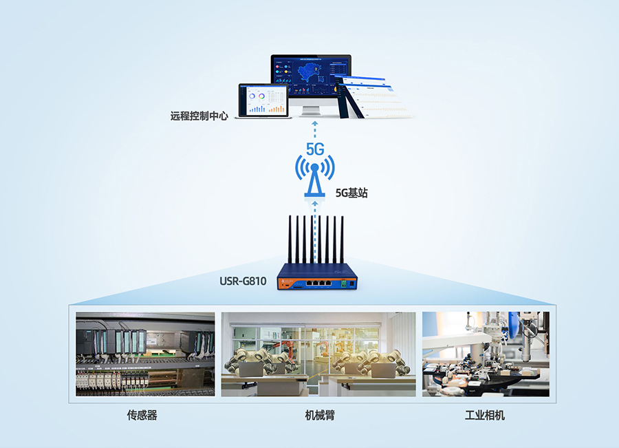 工業(yè)5g路由器作為場景中的核心通信設(shè)備,連接現(xiàn)場傳感設(shè)備等實(shí)施數(shù)據(jù)采集,并通過無線網(wǎng)絡(luò)連接云端實(shí)現(xiàn)遠(yuǎn)程在線控制管理,通過工業(yè)路由器達(dá)到工業(yè)自動化、智能化、科技化管理。