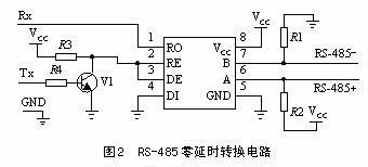 鑒于以上情況,筆者經(jīng)過探索和參照其它相關(guān)電路,設(shè)計(jì)了一種可以實(shí)現(xiàn)RS-485接收和發(fā)送零延時(shí)轉(zhuǎn)換的電路,如圖2所示。