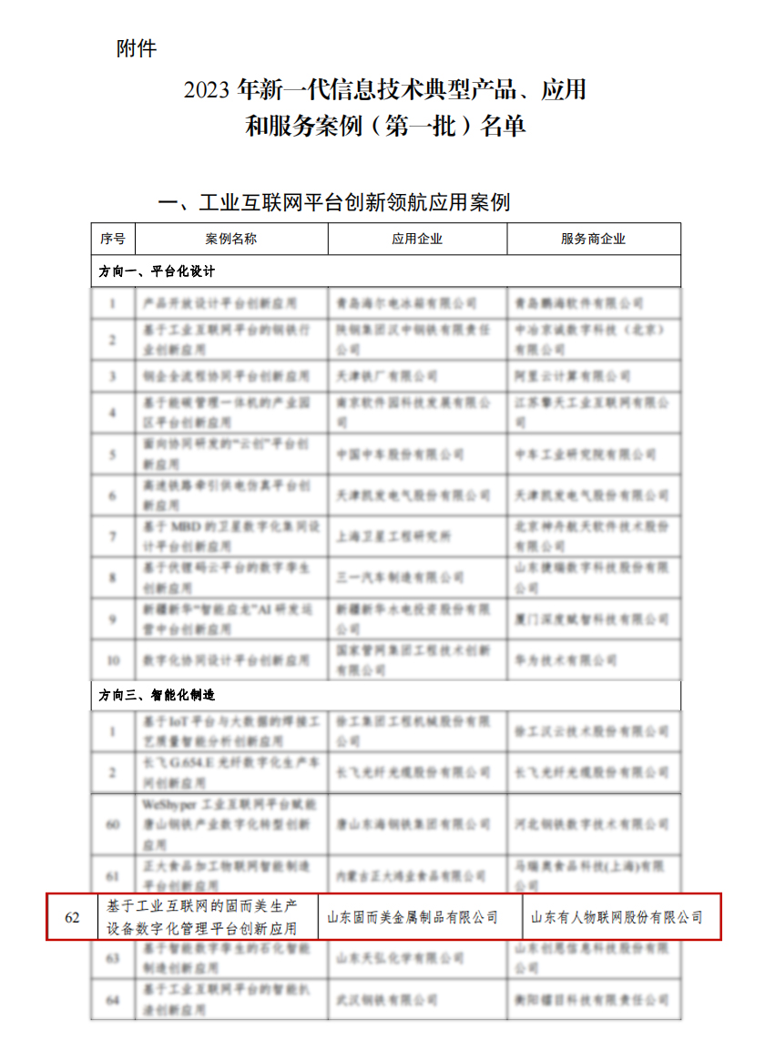 12月27日,工業(yè)和信息化部發(fā)布《關(guān)于2023年新一代信息技術(shù)典型產(chǎn)品、應(yīng)用和服務(wù)案例(第一批)名單的公示》。經(jīng)企業(yè)自主申報、單位推薦、專家評審等環(huán)節(jié),本次工業(yè)互聯(lián)網(wǎng)平臺創(chuàng)新領(lǐng)航應(yīng)用案例全國共入選211個案例,有人物聯(lián)網(wǎng)“基于工業(yè)互聯(lián)網(wǎng)的固而美生產(chǎn)設(shè)備數(shù)字化管理平臺創(chuàng)新應(yīng)用”榮登“工業(yè)互聯(lián)網(wǎng)平臺創(chuàng)新領(lǐng)航應(yīng)用案例-智能化制造方向”名單。
