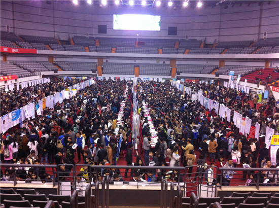 2016年3月26日,山東省濟(jì)南市,山東大學(xué)中心校區(qū)體育館內(nèi)舉行畢業(yè)生招聘會,673家用人單位提供萬余個(gè)就業(yè)崗位,吸引了1萬多名畢業(yè)生前來尋找工作。