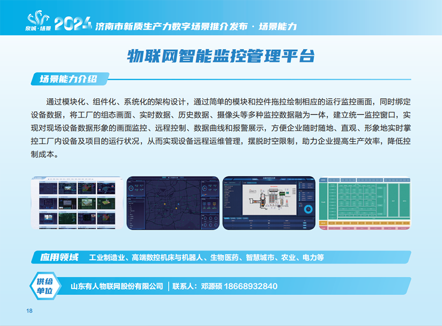 其中,有人物聯(lián)網(wǎng)“物聯(lián)網(wǎng)智能監(jiān)控管理平臺(tái)”是針對(duì)行業(yè)用戶互聯(lián)網(wǎng)碎片化需求、企業(yè)客戶開發(fā)技術(shù)門檻高和開發(fā)周期長(zhǎng)等問題,打造的快速自定義物聯(lián)網(wǎng)應(yīng)用的數(shù)據(jù)服務(wù)平臺(tái),具有接入能力強(qiáng)、安全性高、應(yīng)用便捷等優(yōu)點(diǎn),可通過模塊化、組件化、系統(tǒng)化的架構(gòu)設(shè)計(jì),運(yùn)用簡(jiǎn)單的模塊和控件繪制相應(yīng)的運(yùn)行監(jiān)控畫面,同時(shí)綁定設(shè)備數(shù)據(jù),將工廠的組態(tài)畫面、實(shí)時(shí)數(shù)據(jù)、歷史數(shù)據(jù)、攝像頭等多種監(jiān)控?cái)?shù)據(jù)融為一體,建立統(tǒng)一監(jiān)控窗口,實(shí)現(xiàn)對(duì)現(xiàn)場(chǎng)設(shè)備數(shù)據(jù)形象的畫面監(jiān)控、遠(yuǎn)程控制、數(shù)據(jù)曲線和報(bào)警展示,方便企業(yè)隨時(shí)隨地、直觀、形象地實(shí)時(shí)掌控工廠內(nèi)設(shè)備及項(xiàng)目的運(yùn)行狀況,實(shí)現(xiàn)設(shè)備遠(yuǎn)程運(yùn)維管理,擺脫時(shí)空限制,助力企業(yè)提高生產(chǎn)效率,降低控制成本。目前,平臺(tái)基于“云端+終端”一體化模式,提供“+物聯(lián)網(wǎng)”服務(wù)能力,聚焦工業(yè)、農(nóng)業(yè)、環(huán)保等16個(gè)行業(yè)及19個(gè)場(chǎng)景,可廣泛應(yīng)用在工業(yè)制造業(yè)、高端數(shù)控機(jī)床與機(jī)器人、生物醫(yī)藥、智慧城市、農(nóng)業(yè)、電力、共享等多種行業(yè),為企業(yè)、行業(yè)和地區(qū)的數(shù)字化轉(zhuǎn)型發(fā)展提供賦能。