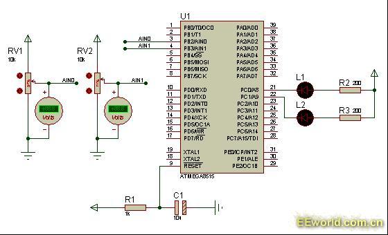 仿真說明:當AIN1低于AIN0時L1(綠燈亮),當AIN1高于AIN0時L2亮(黃燈亮)。