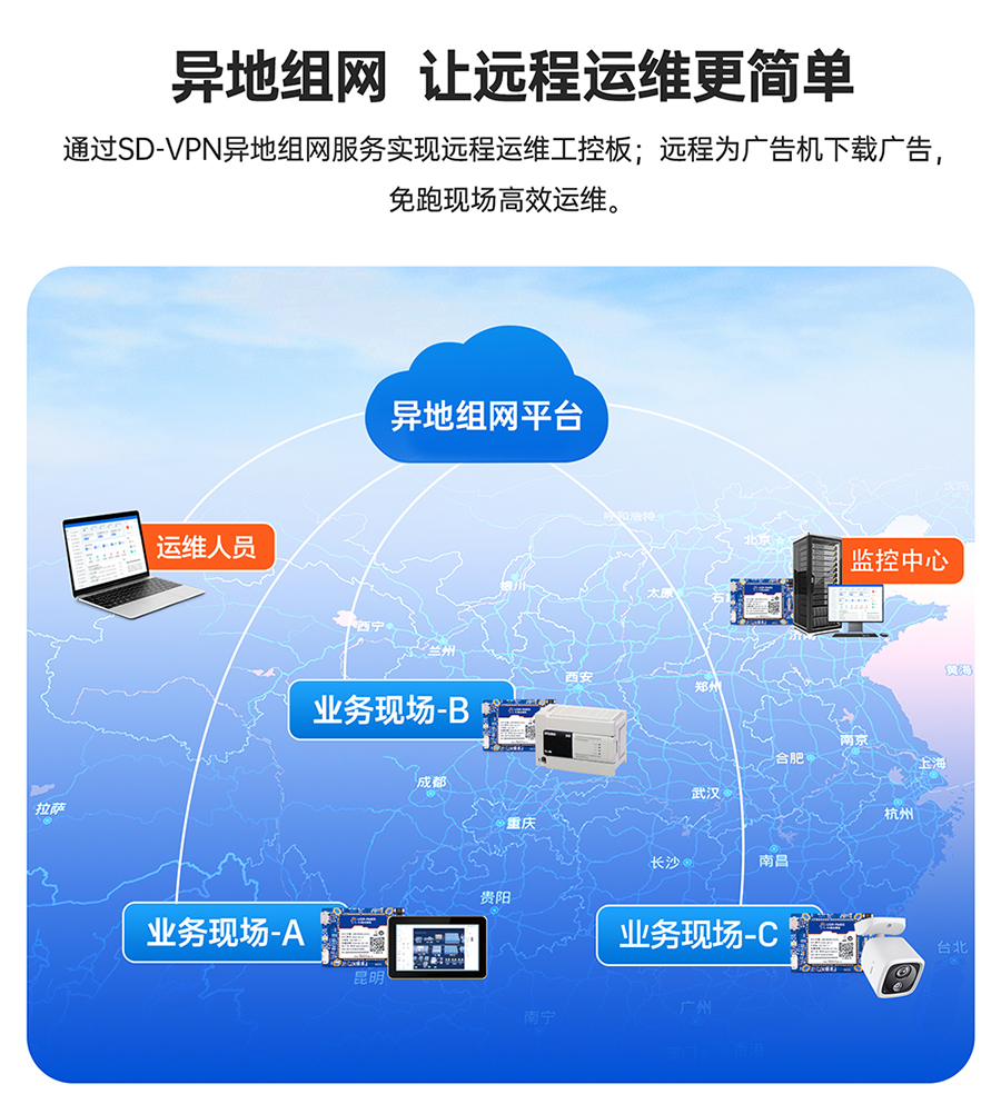 ? 【支持異地組網(wǎng)】通過SD-VPN技術(shù)直控分布全國的業(yè)務(wù)現(xiàn)場(充電樁/廣告機(jī)/傳感器等),運維成本一降再降。