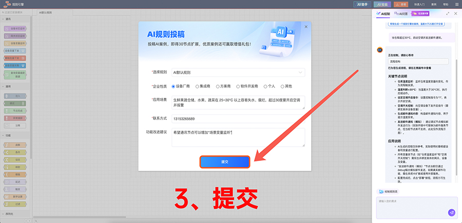 1、進(jìn)入規(guī)則引擎,AI 完成規(guī)則繪制后 → 點擊【AI投稿】;