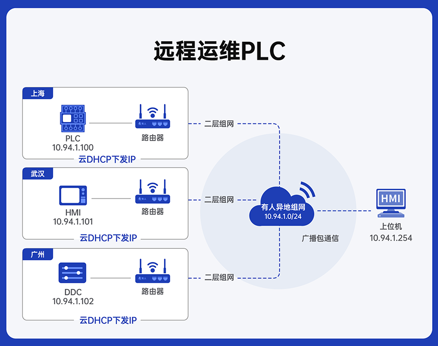 現(xiàn)在通過有人異地組網(wǎng)二層組網(wǎng)技術(shù),將全國各地終端組成大局域網(wǎng),完美解決了PLC、HMI、DDC等工業(yè)設(shè)備的遠(yuǎn)程運(yùn)維難題。