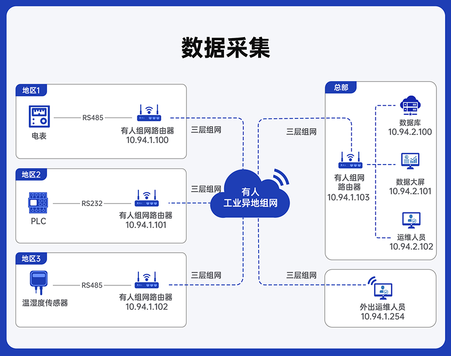 傳統(tǒng)數(shù)據(jù)采集需要通過串口服務(wù)器對接公網(wǎng)專線服務(wù)器的方式,點(diǎn)對點(diǎn)或小范圍數(shù)采扯公網(wǎng)專線年費(fèi)較高。使用有人組網(wǎng)路由器,無需公網(wǎng)即可實現(xiàn)PLC、逆變器、電表、傳感器等工業(yè)串口設(shè)備數(shù)據(jù)采集。