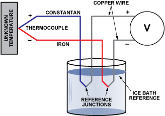 在參考接合點處產(chǎn)生的電壓取決于測量接合點和參考接合點兩處的溫度。由于熱電偶是一種差分器件而不是絕對式溫度測量器件,必須知道參考接合點溫度以獲得精確的絕對溫度讀數(shù)。這一過程被稱為參考接合點溫度補償(冷接合點補償)。
