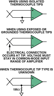 設計熱電偶信號調(diào)理時應在測量接地熱電偶時避免接地回路,還要在測量絕緣熱電偶時具有一條放大器輸入偏壓電流路徑。此外,如果熱電偶尖端接地,放大器輸入范圍的設計應能夠應對熱電偶尖端和測量系統(tǒng)地之間的任何接地差異(圖5)。