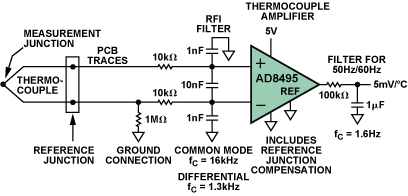 因為電壓信號微弱,信號調(diào)理電路一般需要約100左右的增益,這是相當簡單的信號調(diào)理。更棘手的事情是如何識別實際信號和熱電偶引線上的拾取噪聲。熱電偶引線較長,經(jīng)常穿過電氣噪聲密集環(huán)境。引線上的噪聲可輕松淹沒微小的熱電偶信號。