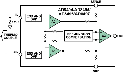 AD8495的更多詳情:圖7所示為AD8495熱電偶放大器的框圖。放大器A1、A2和A3(及所示電阻)一道形成一個儀表放大器,它使用恰好產(chǎn)生5 mV/°C輸出電壓的一個增益來對K型熱電偶輸出進行放大。在標記“Ref junction compensation”(參考接合點補償)的框內(nèi)是一個環(huán)境溫度傳感器。在測量接合點溫度保持穩(wěn)定的條件下,如果參考接合點溫度由于任何原因而上升,來自熱電偶的差分電壓就會降低。如果微型封裝的(3.2 mm × 3.2 mm × 1.2 mm)AD8495接近參考接合點的熱區(qū)域,參考接合點補償電路將額外電壓施加到放大器內(nèi),這樣輸出電壓保持恒定,從而對參考溫度變化進行補償。