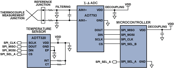 第二種解決方案提供最高測量精度,還可使用各種熱電偶類型。作為一種基于軟件的參考接合點補償技術,它依賴于高精度ADT7320數(shù)字溫度傳感器來提供精度遠超迄今所實現(xiàn)精度的參考接合點補償測量。ADT7320在–40°C至+125°C溫度范圍完全校準并指定。完全透明,不同于傳統(tǒng)的熱敏電阻或RTD傳感器測量,它既不需要在電路板裝配后進行高成本的校準步驟,也不會因校準系數(shù)或線性化程序而消耗處理器或內(nèi)存資源。其功耗只有數(shù)毫瓦,避免了降低傳統(tǒng)電阻式傳感器解決方案精度的自發(fā)熱問題。