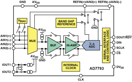 消除噪聲并放大電壓:AD7793如圖9所示,使用AD7793—一種高精度、低功耗模擬前端來測量熱電偶電壓。熱電偶輸出經(jīng)過外部濾波后連接到一組差分輸入AIN1(+)和AIN1(–)。信號然后依次經(jīng)過一個多路復用器、一個緩沖器和一個儀表放大器(放大熱電偶小信號)發(fā)送到一個ADC,它將該信號轉(zhuǎn)換為數(shù)字信號。