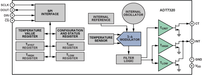 校正非線性度:ADT7320在整個額定溫度范圍(–40°C至+125°C)內(nèi)呈現(xiàn)出色的線性度,不需要用戶校正或校準。因而其數(shù)字輸出可視為參考接合點狀態(tài)的精確表示。
