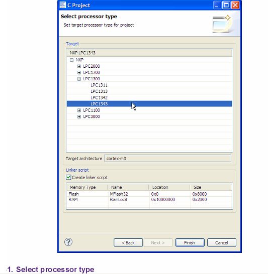 最后,彈出“SelcetProcessorType”對話框。在這里選擇MCU的型號。然后單擊“Finish”。至此完成了一個項目的創(chuàng)建。本項目中MCU型號是LPC1343。如下圖所示。