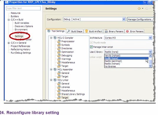 在相同的對話框中,選擇MCU Linker下面的Target選項,再次設(shè)置鏈接時的標準庫函數(shù)為Redlib。默認設(shè)置是Redlib(semihost),語序所有I/O通過LPCXpresso控制臺連接到PC。如下圖所示。