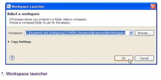6.5 在新工作區(qū)創(chuàng)建一個‘skeleton’項目 LPCXpresso包含多種項目模板以幫助快速建立項目文件。6.5.1 創(chuàng)建一個新工作區(qū) 從“File”菜單中選擇“Switch Workspace”,然后選擇“Other…”。將會彈出一個“Workspace Launcher”對話框。輸入或者選擇一個新的路徑,在此將這個新工作區(qū)命名為“NewWorkspace”。如下圖所示。
