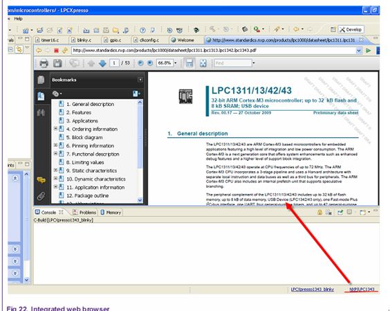 6.1.5 退出調(diào)試模式并停止調(diào)試 在調(diào)試窗口中的工具欄內(nèi)點擊”Stop”按鈕(紅色方形按鈕),即可終止調(diào)試并退出調(diào)試模式。6.1.6 程序下載。要想獲得最好的編程和調(diào)試效果,計算機的操作系統(tǒng)應(yīng)該是Vista 或者Windows 7,在Windows XP操作系統(tǒng)下,調(diào)試運行的速度明顯要慢一些。但是并不影響代碼的執(zhí)行速度,只是軟件的響應(yīng)速度等變慢了。同樣需要確認LPCXpresso開發(fā)板正確的直接連接到PC機上。通過hub、網(wǎng)關(guān)或USB分線器連接的效果不是很好。6.2 數(shù)據(jù)手冊閱覽器 LPCXpresso內(nèi)置了一個集成網(wǎng)頁瀏覽器,在項目中直接點擊右下角的MCU型號,就可以查看該型號MCU的數(shù)據(jù)手冊。如下圖所示。