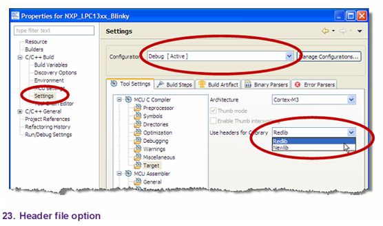 6.3 代碼長度6.3.1 格式輸出 當(dāng)優(yōu)化項目大小時,如果使用格式輸出,必須在項目屬性對話框中將Redlib選為標準庫。這個選項必須在兩個位置進行設(shè)置:頭文件、庫。最好也要在調(diào)試目標和發(fā)布目標這兩處進行設(shè)置。頭文件選項在左側(cè)的樹形文件列表的C/C++ Build文件夾中。需要確認工具設(shè)置標簽是否處于激活狀態(tài),并且在右側(cè)的樹形文件列表中選擇MCU C Compiler下面的Target,在設(shè)置選框中選擇調(diào)試或者發(fā)布目標,在C庫頭文件下選擇Redlib,這個通常是默認設(shè)置。如下圖所示。