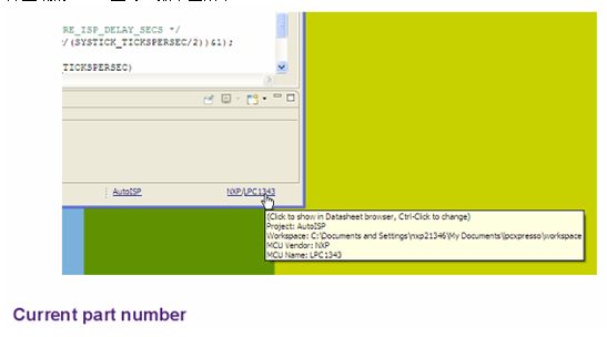 確認MCU型號是否正確。當(dāng)前選擇的MCU型號在LPCXpresso界面窗口下面的狀態(tài)欄中顯示。通過按住鍵盤上的“Ctrl”鍵并點擊可以修改MCU型號。在彈出的對話框中選擇正確的MCU型號。如下圖所示。