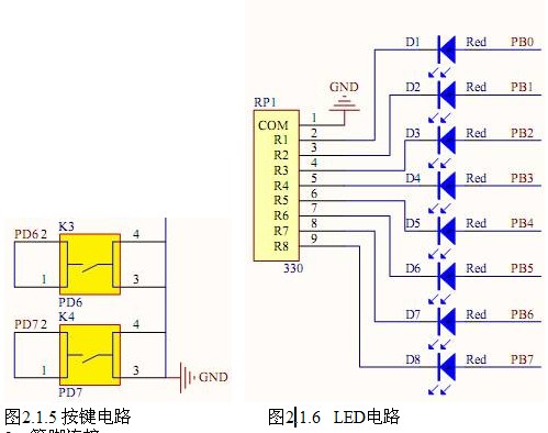圖2.1.5是按鍵檢測電路,兩個按鍵分別連接到單片機的PD6、PD7管腳,AVR單片機在程序里把PD6、PD7設置為帶上拉的端口,這樣按鍵沒有按