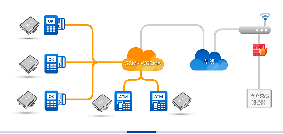 在零售行業(yè)中,無線POS機(jī)和ATM機(jī)使用3G DTU實(shí)現(xiàn)遠(yuǎn)程聯(lián)網(wǎng),實(shí)現(xiàn)安全支付,簡單便利。