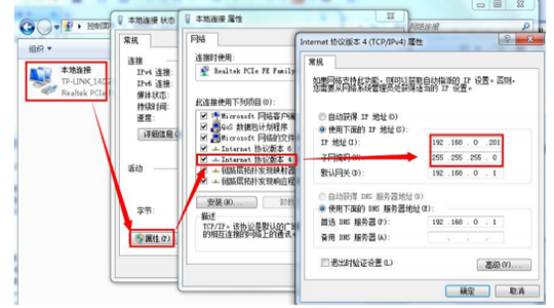 (3)串口服務(wù)器與電腦直接相連后,要給電腦設(shè)置一個(gè)靜態(tài)的,與N540的IP在同一個(gè)網(wǎng)段的IP,比如:192.168.0.201。