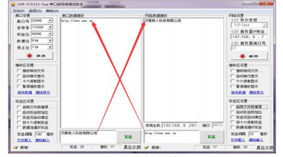 以上內(nèi)容操作確認(rèn)無誤后,就可以進(jìn)行串口服務(wù)器與以太網(wǎng)的數(shù)據(jù)傳輸調(diào)試了