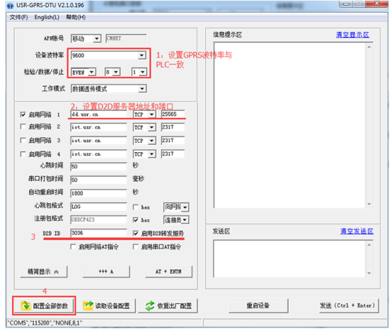 第一,設(shè)置GPRS DTU參數(shù):設(shè)置驗(yàn)證ID為3036.還需要設(shè)置GPRS串口的參數(shù),波特率,校驗(yàn)位、數(shù)據(jù)位、停止位。