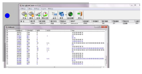 第四,數(shù)據(jù)監(jiān)控。虛擬串口軟件點(diǎn)擊監(jiān)控。COM為組態(tài)軟件發(fā)送的數(shù)據(jù),NET為PLC通過GPRS網(wǎng)絡(luò)發(fā)給電腦端口的數(shù)據(jù)。能發(fā)送能接收,說明數(shù)據(jù)傳輸正常。
