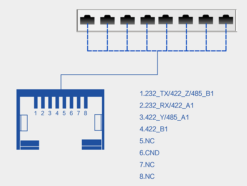 八串口服務(wù)器用于實(shí)現(xiàn)串口到以太網(wǎng)口的數(shù)據(jù)的雙向透明傳輸,通常具有RS232 / RS485 / RS422接口之間的數(shù)據(jù)進(jìn)行轉(zhuǎn)換。有人近期推出一款八串口服務(wù)器USR-N668,所有串口封裝為RJ45口形式,可以通過RJ45的轉(zhuǎn)接板與DB9針串口進(jìn)行轉(zhuǎn)換。但八串口服務(wù)器的引腳定義如果弄不清楚,必然會(huì)影響項(xiàng)目現(xiàn)場中的連接情況。