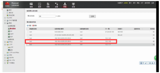 第二,設(shè)置華為路由器路由。華為路由器上增加靜態(tài)路由0.0.0.0/0.0.0.0 27.223.89.193為路由器默認(rèn)路由,192.168.4.0/255.255.255.0 10.2.1.66 為手動(dòng)添加的路由。