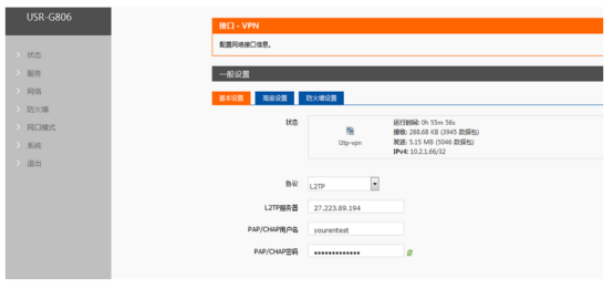 第三,設(shè)置USR-G806的VPN。設(shè)置VPN接口:網(wǎng)絡(luò)---接口---添加接口。協(xié)議還是選擇L2TP。然后設(shè)置相應(yīng)的PAP/CHAP的用戶名和密碼。
