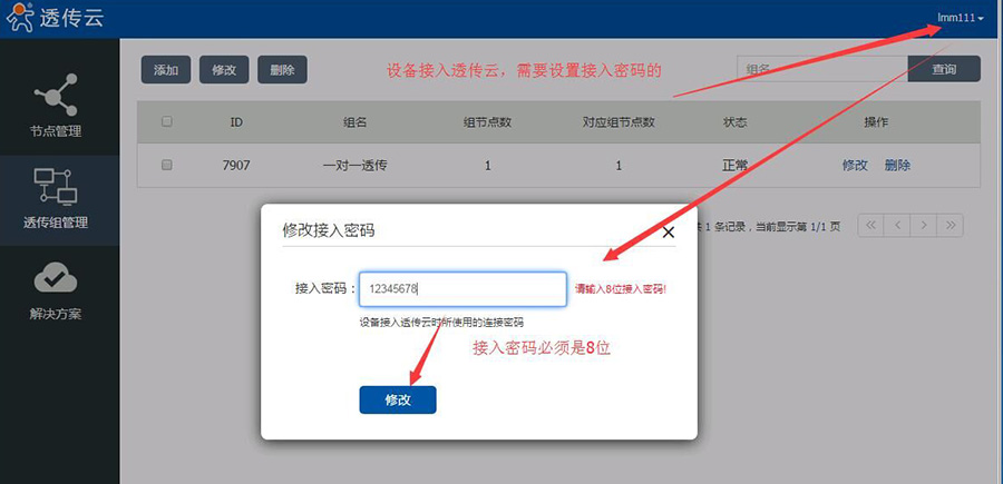 第五, 設(shè)置接入透?jìng)髟频拿艽a,也是兩個(gè)透?jìng)髟O(shè)備的通訊密碼
