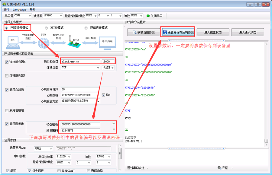 第六,設(shè)置的DTU參數(shù),設(shè)備編號(hào)根據(jù)實(shí)際情況來填寫,需要是透?jìng)鞣纸M中其中的一個(gè)。