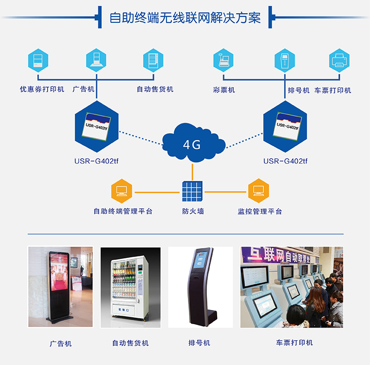 自助終端設(shè)備需要大數(shù)據(jù)量網(wǎng)絡(luò)傳輸,通過4G模塊高速聯(lián)網(wǎng),將所有終端業(yè)務(wù)數(shù)據(jù)及設(shè)備運(yùn)行狀態(tài)實(shí)時(shí)傳輸?shù)綐I(yè)務(wù)中心,降低了業(yè)務(wù)中心運(yùn)營(yíng)成本,管理運(yùn)營(yíng)規(guī)?;?。
